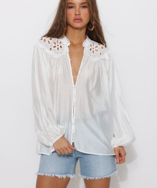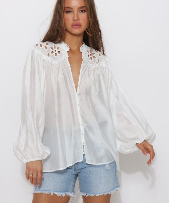 חולצה מכופתרת שקפקפה תחרה שרוול מתרחב